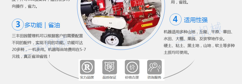 服務(wù)周到,不多花一分錢,細致周到的服務(wù)和可靠的信譽贏得客戶。田園管理機產(chǎn)品的各項指標(biāo)已 達到國內(nèi)外同類產(chǎn)品的先進水平。